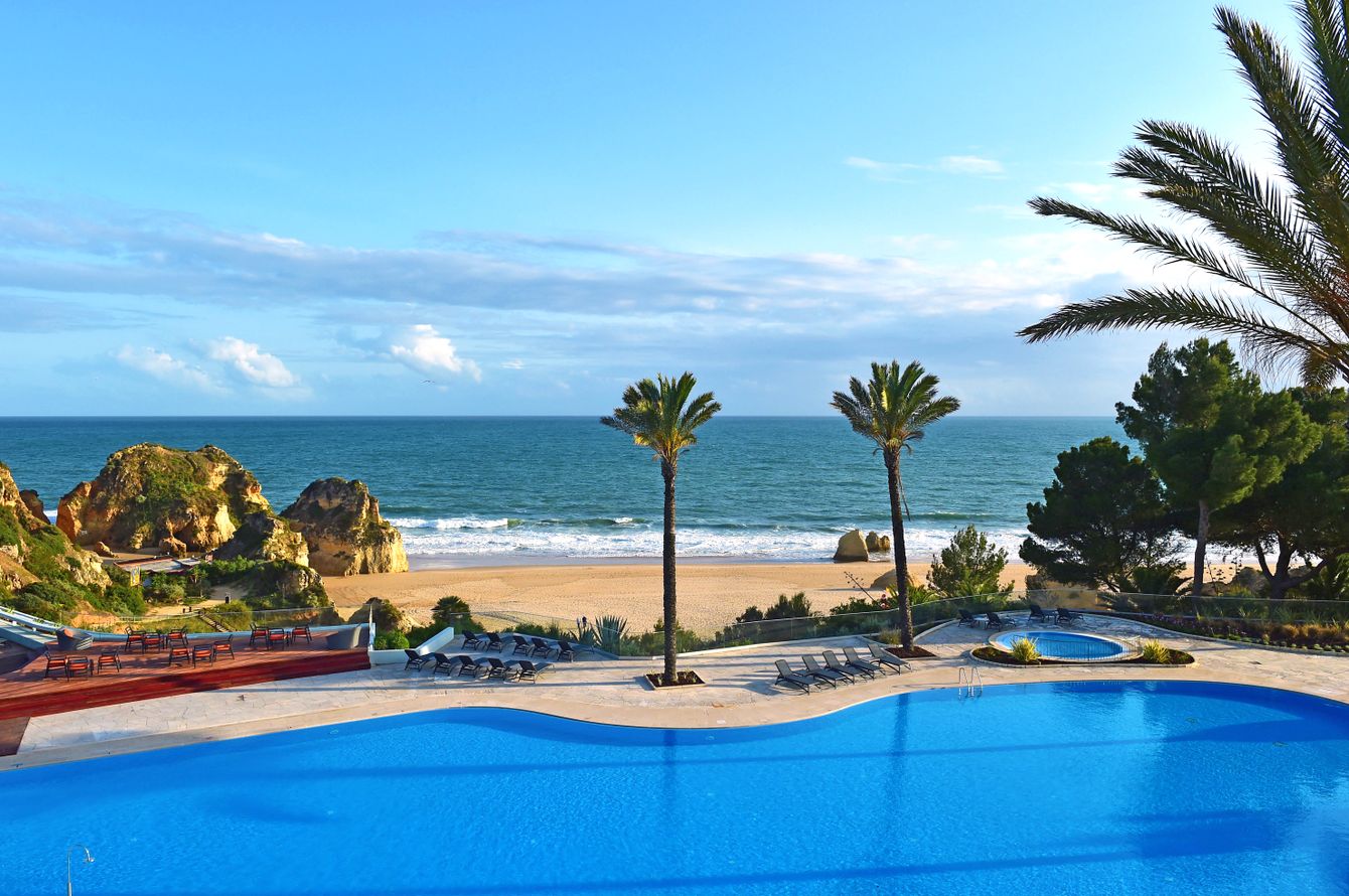 Ruhig, auf einer Klippe direkt über dem Meer und dem kilometerlangen, von Felsen gesäumten Sandstrand Praia dos Três Irmãos, einem der schönsten Strände der Algarve. Den Strand erreichen Sie vom Hotel aus bequem mit einem Lift. Bis ins Zentrum von Alvor mit Einkaufsmöglichkeiten, Restaurants und Bars sind es etwa 2 km. Das belebte Stadtzentrum von Portimão ist rund 6 km entfernt. Den Flughafen Faro erreichen Sie nach ca. 75 km.