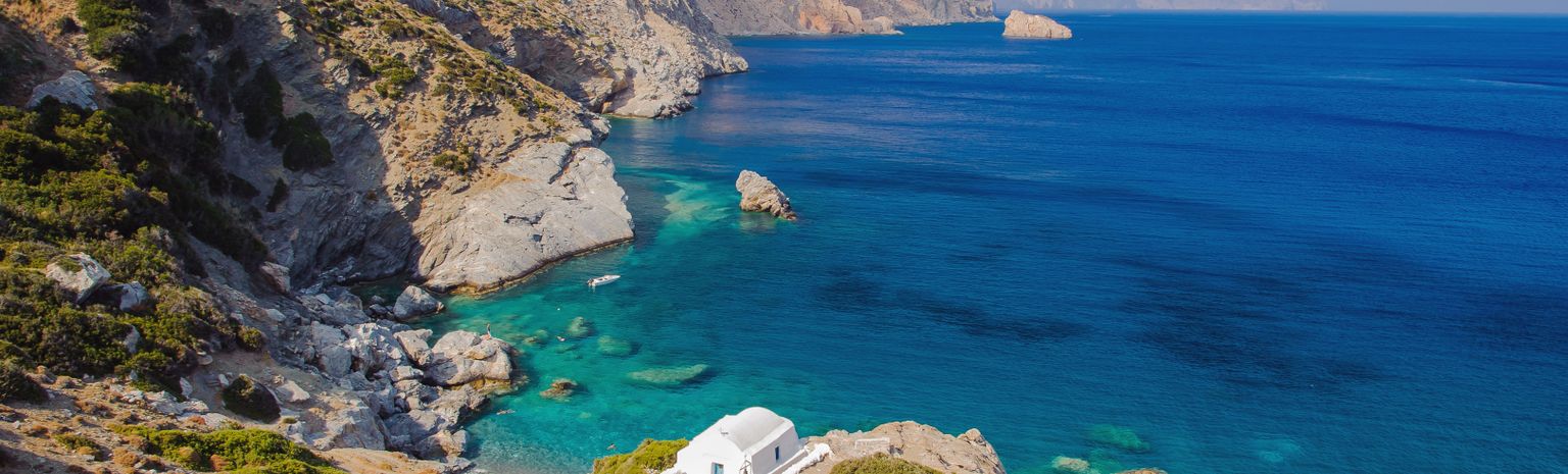 Die gebirgige, eher wilde Insel Amorgos ist rund 128 km2 gross und die östlichste Insel der Kykladen. Da die Insel keinen Flugplatz besitzt, ist sie nur mit dem Schiff erreichbar. Amorgos erlangte weltweite Bekanntheit durch den Film „The Big Blue“ von Luc Besson. Kamen früher nur Backpacker hierher, so hat sich die Insel heute zu einer richtigen Trend-Destination entwickelt. Die Dörfer und Badestrände liegen relativ nah beieinander und sind mit Busverbindungen gut erschlossen. Wer gerne zu Fuss unterwegs ist, findet vor allem im Frühling und im Herbst in der wilden Landschaft herrliche Möglichkeiten. Sehr sehenswert ist das Kloster Chosowiotissa, das an einer spektakulären Lage an einen Felshang gebaut wurde und nur wenige Meter breit ist. Leuchtend weiss schmiegt es sich an den Fels, während ein Mönch hier Tag und Nacht Wache hält. Amorgos befindet sich etwas abseits vom grossen Rummel und ist deshalb besonders für Besucher geeignet, die einen entspannten Aufenthalt in einer ursprünglichen Umgebung verbringen wollen