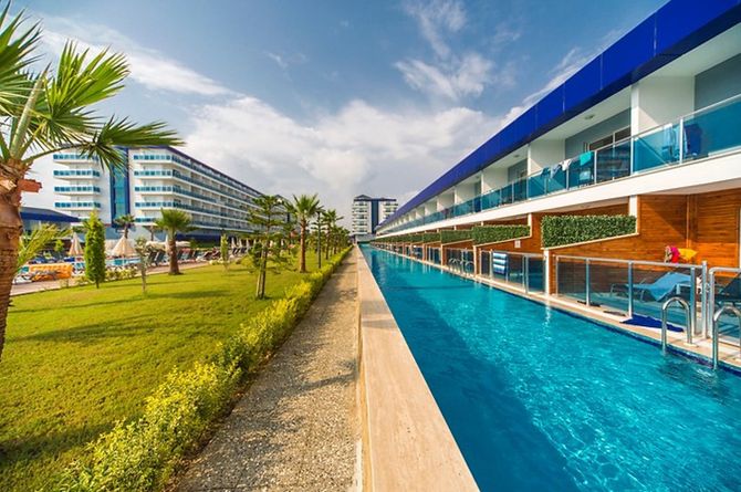 Das Hotel besteht aus 2 Haupt- und 3 Nebengebäuden, die in maritimen Farben gestaltet auf dem Hotelgelände stehen. Die Einrichtung beinhaltet einen Empfangsbereich mit Réception und WLAN (gratis). Buffet-Hauptrestaurant, 2 A-la-carte-Restaurants, Snackbar, Lobbybar, Strandbar. Coiffeur, Geschäfte. Parkplätze gratis. Im Aussenbereich befindet sich eine Poollandschaft mit mehreren Pools, einem Aquapark mit Wasserrutschen, Sonnenterrassen und einer Poolbar. Die Nutzung von Liegestühlen, Sonnenschirmen und Badetüchern an den Pools und am Strand ist gratis.