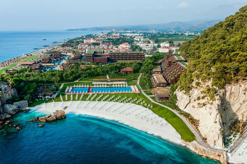 Das luxuriöse Hotel besteht aus einem Hauptgebäude sowie mehreren Nebengebäuden und Villen. Elegante Empfangshalle mit Réception und WLAN (gratis). 4 A-la-carte-Restaurants mit türkischer, italienischer, mexikanischer und internationaler Küche sowie Fischspezialitäten, 2 exklusive Gourmetrestaurants (asiatisch und Steakhouse), 2 Snackrestaurants, Patisserie, Chocolatier, Poolbar, 11 Bars. Spielezimmer, Einkaufspassage mit mehreren Geschäften wie Juwelier, Minimarkt, Boutiquen und Souvenirshop und Coiffeur. Weitläufige und grosszügig konzipierte Gartenanlage mit 2 Pools, Meerwasserpool (heizbar), Aquapark mit 7 Wasserrutschen (für Gäste ab 12 Jahren) und Sonnenterrasse. Die Nutzung von Liegestühlen, Sonnenschirmen und Badetüchern am Pool und am Strand ist gratis. Strandpavillons gegen Gebühr.