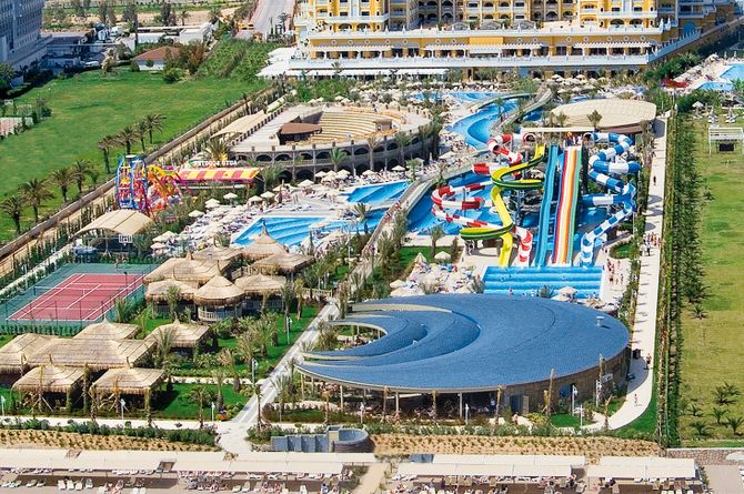 Auf rund 53'000 m2 begrüsst die palastartige und moderne Hotelanlage die Gäste in einer eleganten Empfangshalle mit Réception, WLAN (gratis). Für Ihr leibliches Wohl und kulinarische Highlights sorgen das internationale Buffet-Hauptrestaurant, die 5 A-la-carte-Restaurants mit italienischen, fernöstlichen, türkischen, mexikanischen sowie Grill-Köstlichkeiten und Meeresfrüchten, Snackrestaurant, Bistro/Patisserie und der Food Corner mit verschiedenen Snack-Angeboten. Eine kleine Erfrischung und ein gemütliches Beisammensein können Sie in den diversen Bars geniessen. In der weitläufigen Aussenanlage verteilen sich eine grosszügig angelegte Poollandschaft mit Poolbar und Sonnenterrasse, ein Aquapark mit 5 Wasserrutschen sowie ein Vergnügungspark. Die Nutzung von Liegestühlen und Sonnenschirmen ist am Pool gratis, am Strand gegen Gebühr.