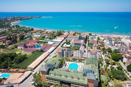 Etwa 200 m vom flach abfallenden und mit der Blauen Flagge ausgezeichneten Sandstrand. Side ist rund 1 km entfernt. Es verkehren Taxis und Minibusse. Die Distanz zum Flughafen Antalya beträgt ca. 65 km.