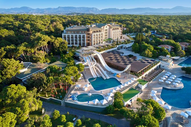 Die moderne Anlage besteht aus einem mehrstöckigen Hauptgebäude und 2–3-stöckigen Reihenbungalows, umgeben vom schönen Pinienwald Sorguns. Zur Einrichtung gehören ein Empfangsbereich mit Réception und WLAN (gratis). Kulinarisch verwöhnen Sie das Buffet-Hauptrestaurant, 7 A-la-carte-Restaurants (chinesische, japanische, italienische, griechische, türkische Küche; Steak-Spezialitäten), Patisserie, 2 Snackbars, und mehrere Bars. Im Aussenbereich befindet sich die gepflegte Gartenanlage mit 4 Pools (1 nur für Erwachsene), Aquapark mit 5 Wasserrutschen und Sonnenterrassen. Die Nutzung von Liegestühlen, Sonnenschirmen und Badetüchern an den Pools und am Strand ist gratis. Parkplatz gratis (nach Verfügbarkeit). E-Ladestation gegen Gebühr (nach Verfügbarkeit).