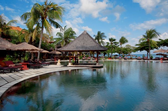 Die reich verzierte Lobby entführt gleich zu Beginn in einen balinesischen Traum. Im halboffenen Restaurant in Strandnähe wird kulinarische Vielfalt geboten, Bar mit Meersicht, Pool mit Bar, Boutique, Gratis-WLAN.