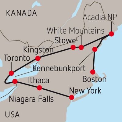 Lassen Sie sich verzaubern von charmanten Fischerorten, unendlichen Wäldern, glitzernden Seen und rauen Küsten. Der Nordosten Nordamerikas bietet Ihnen ursprüngliche Natur, allen voran das gewaltige Naturschauspiel der Niagarafälle. Geniessen Sie auf dieser Reise die gute Küche dieser Region und tauchen Sie ein in das bunte Treiben der Grossstädte.