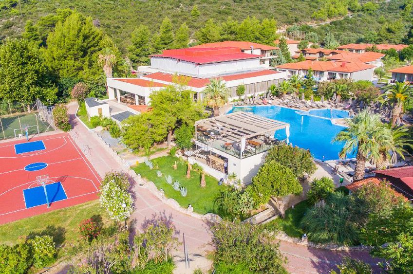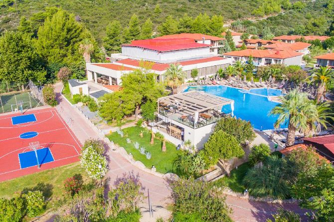 Das Hotel verbindet modernen Komfort mit der unberührten Schönheit der griechischen Natur und besteht aus einem Hauptgebäude und 11 Nebengebäuden. Einladender Empfangsbereich mit Réception und WLAN (gratis). Internationales Buffet-Hauptrestaurant, Poolbar, Minimarkt. Der Aussenbereich verfügt über einen üppigen, 24 ha grossen Garten voller herrlicher Düfte und blühender Vegetation sowie 2 Pools mit Sonnenterrasse. Die Nutzung von Liegestühlen, Sonnenschirmen und Badetüchern am Pool und am Strand ist gratis. Parkplatz gratis (nach Verfügbarkeit).