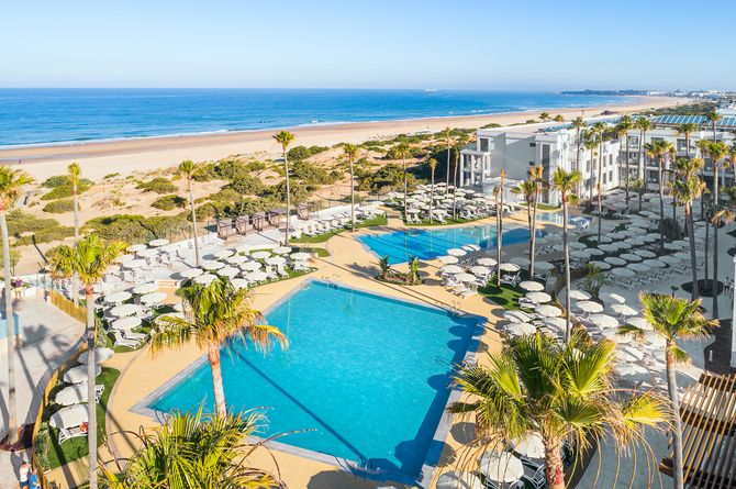 Dieses Hotel liegt direkt an der sanft abfallenden Sandküste von Playa la Barrosa. Nur etwa 300 m entfernt locken vielfältige Einkaufsmöglichkeiten, Restaurants und Bars. Zudem ist eine Bushaltestelle in knapp 200 m erreichbar. Ein besonderer Geheimtipp für Ausflugsziele in der Nähe ist das charmante Dorf Vejer de la Frontera mit seinen weiss getünchten Häusern und engen Gassen. Zum Flughafen Jerez sind es etwa 65 km, zum Flughafen Sevilla rund 150 km.