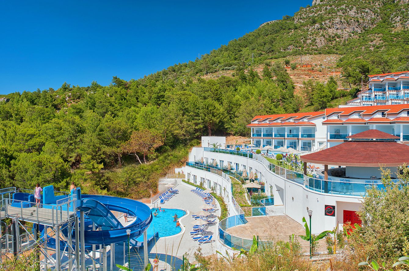 Ruhig, terrassenförmig am Hang gelegen über der berühmten Bucht von Ölüdeniz mit fantastischem Panoramablick. Der öffentliche Sand-/Kieselstrand liegt rund 2 km entfernt – Gratis-Shuttlebus. Einige Geschäfte und Restaurants in der Umgebung. Weitere Einkaufs- und Unterhaltungsmöglichkeiten befinden sich im ca. 9 km entfernten Ort Fethiye – gute Verbindungen mit Minibussen und Taxis. Zum Flughafen von Dalaman sind es etwa 65 km. Der Flughafen Antalya liegt in einer Distanz von ca. 215 km.