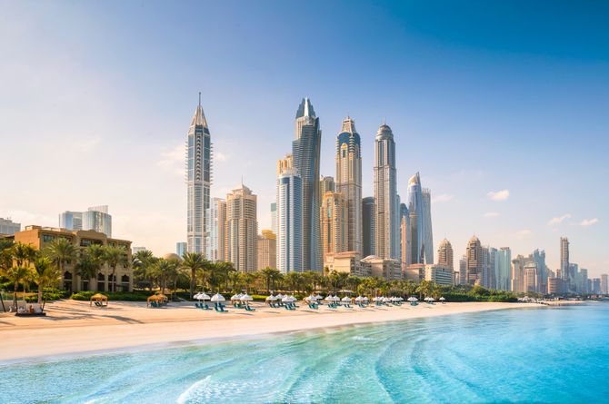 Direkt am exklusiven, rund 1 km langen, feinsandigen Privatstrand von Jumeirah, nahe der Dubai Marina, dem Emirates Golf Club und der bekannten Palm Jumeirah. Es verkehrt ein Gratis-Shuttlebus zur Shoppingmall und dem Aquaventure-Wasserpark. Zum Flughafen Dubai sind es ca. 35 km.