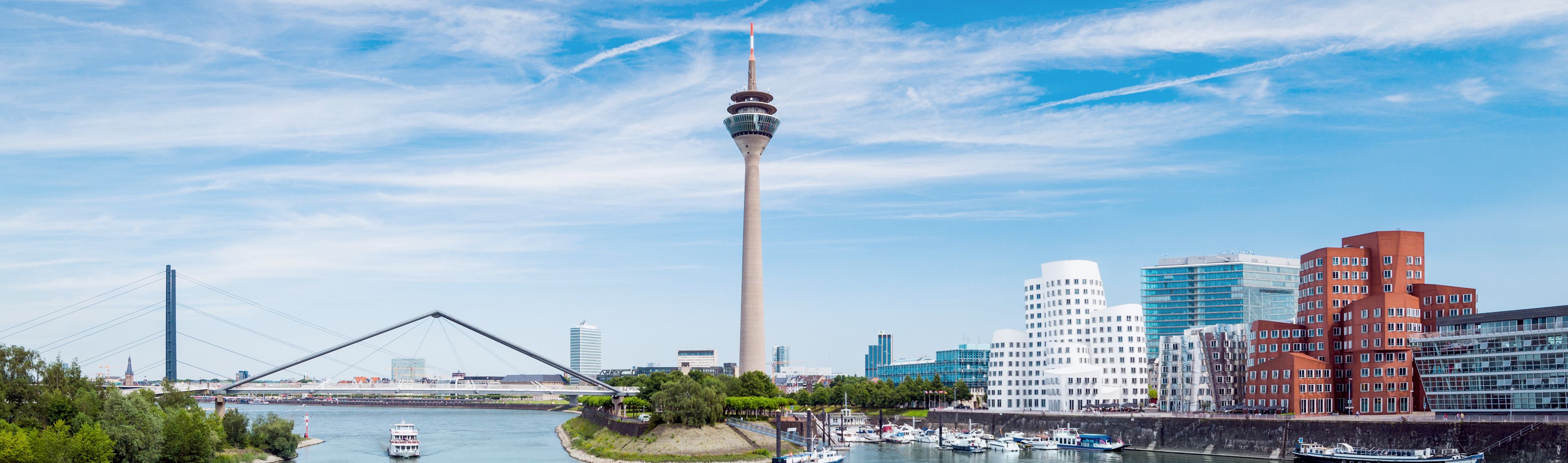 Die Stadt am Rhein verfügt über zwei Binnenhäfen und ist Sitz von vier Hochschulen, darunter die renommierte Kunstakademie sowie die Heinrich-Heine-Universität. Düsseldorf wird durch die eigene moderne Architektur ausgezeichnet. Die Gehry-Bauten im MedienHafen oder der Kö-Bogen direkt am Hofgarten prägen das aussergewöhnliche Stadtbild. Auffällig ist auch der über alles hinwegragende Rheinturm. Ein Fernsehturm, welcher Ihnen mit 240,5 m Höhe einen fantastischen Blick über die Region bietet. Schauen Sie entlang des Rheins oder lassen Sie Ihren Blick in die Weite Nordrhein-Westfalens schweifen. Erleben Sie den Ausblick hautnah.