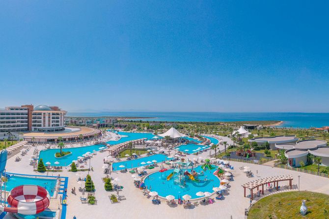 Das Aquasis Deluxe Resort präsentiert sich als moderne Hotelanlage, die harmonisch in ihre Umgebung integriert ist und aus einem Haupthaus sowie mehreren Nebengebäuden besteht. Die grosszügige Empfangshalle bietet eine Réception, kostenloses WLAN und eine Lobbybar. Kulinarische Vielfalt findet man im internationalen Buffet-Hauptrestaurant und 5 A-la-carte-Restaurants mit türkischer, italienischer, mexikanischer und asiatischer Küche sowie Meeresfrüchten. Ergänzt wird das Angebot durch 2 Snackbars, eine Patisserie, eine Poolbar, eine Strandbar und weitere Bars. Das Hotel verfügt zudem über verschiedene Geschäfte, ein Spielezimmer, ein Amphitheater und einen Coiffeur. Im weitläufigen Aussenbereich befindet sich eine grosse Poollandschaft bestehend aus 3 Pools (1 davon exklusiv für Gäste der Lake Houses, saisonal beheizt), 9 Wasserrutschen und Sonnenterrassen. Liegestühle, Sonnenschirme und Badetücher am Pool sowie am Strand stehen kostenfrei zur Verfügung.