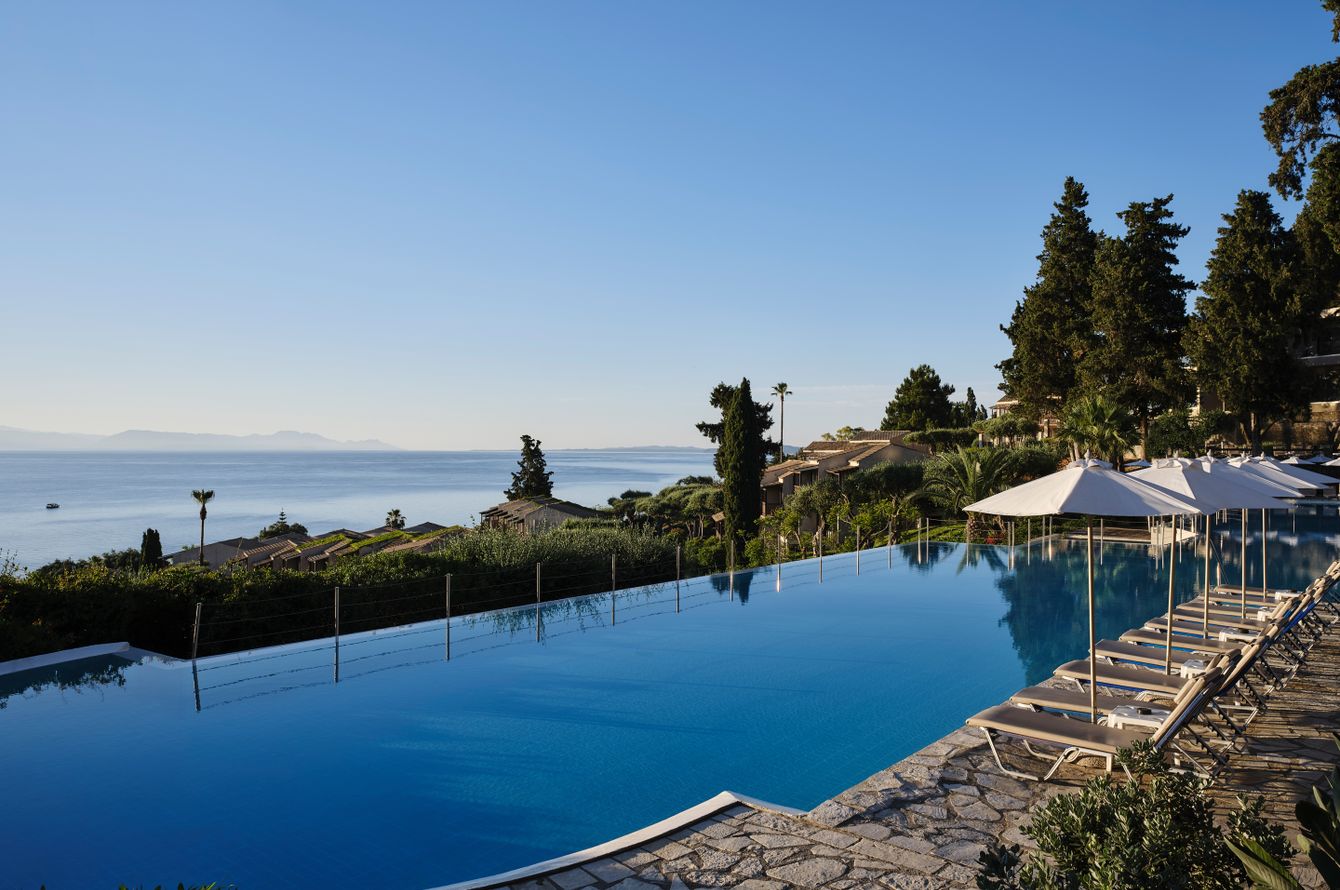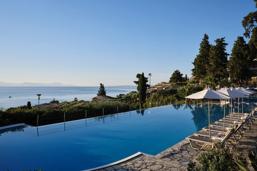 Das in der traditionellen griechischen Bauweise errichtete Hotel thront friedlich auf einem Hügel über seiner eigenen Sand-/Kiesbucht, die etwa 150 m entfernt und bequem durch einen Tunnel erreichbar ist. Direkt vor dem Hotel befindet sich eine Bushaltestelle, die eine gute Anbindung an das nahegelegene Dorf Perama mit seinen Tavernen und Geschäften bietet. Ein besonderer Geheimtipp für Ausflüge in der Nähe ist das malerische Dorf Pelekas. Die Stadt Korfu und der Flughafen Korfu sind rund 10 km entfernt.
