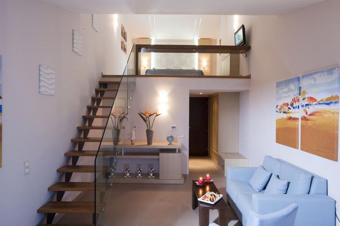 Die Zimmer (27–30 m2) verfügen über Bad oder Regendusche, WC, Föhn, Bademantel, Hausschuhe; Telefon, TV, WLAN (gratis), Safe, Minibar, Tee-/Kaffeekocher, Bettsofa, Klimaanlage; Balkon oder Terrasse. Auch mit Poolsicht buchbar. Die Superior-Zimmer können auch mit Whirlpool oder privatem Pool gebucht werden. Die Maisonette Suiten (45–50 m2) sind mit einer 2. Etage ausgestattet. Weitere Zimmerkategorien auf Anfrage.