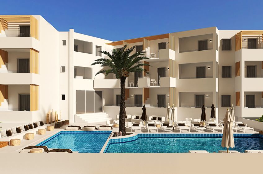 Die moderne, gepflegte Hoteleinrichtung besitzt einen besonderen griechischen Charme. Sie beinhaltet einen Empfangsbereich mit Réception und WLAN (gratis). Für kulinarische Einblicke sorgen das A-la-carte-Restaurant mit inseltypischer und mediterraner Küche und die Bar. Im Aussenbereich befindet sich ein Pool mit Poolbar und begrünter Sonnenterrasse. Die Nutzung von Liegestühlen und Sonnenschirmen am Pool und am Strand ist gratis. Badetücher am Pool gegen Depot. Parkplätze gratis.