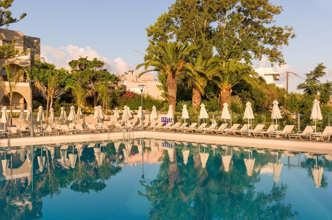 Das Hotel verfügt über einen Empfangsbereich mit Réception, WLAN (gratis). Internationales Buffet-Hauptrestaurant mit Show Cooking, A-la-carte-Restaurant mit griechisch-mediterraner Küche, Poolbar. Parkplätze gegen Gebühr (nach Verfügbarkeit). Im Aussenbereich befindet sich ein Garten mit Palmen, einem Süsswasserpool sowie Sonnenterrassen. Ausserdem gibt es einen Wasserpark mit 4 Wasserrutschen (gegen Gebühr). Die Nutzung von Liegestühlen und Sonnenschirmen ist am Pool gratis, am Strand gegen Gebühr.