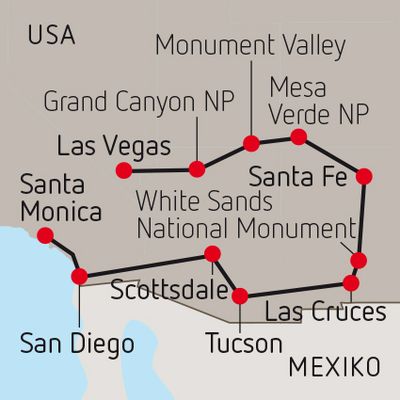 Riesen-Kakteen in Arizonas faszinierender Wüste, grossartige Indianer-Kultur in überwältigenden Felsbehausungen, spanisches Erbe im malerischen Santa Fe, farbenprächtigen Landschaften und weite Sandstrände – auf Schritt und Tritt begeisternde Gegenwart und lebendige Vergangenheit.