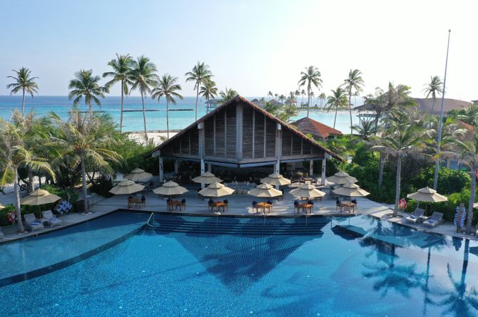 Das Hotel begrüsst Sie in einem einladenden Empfangsbereich mit Réception und WLAN (gratis). Kulinarisch verwöhnt werden Sie im maledivischen Buffetrestaurant, Poolrestaurant, Strandrestaurant sowie im ostasiatischen A-la-carte-Restaurant. Zudem gibt es das mediterrane Meeresfrüchte-Restaurant und das Gourmetrestaurant (auf Anfrage), die Poolbar, Strandbar und Loungebar mit Entertainment. Eine Bibliothek, ein Coiffeur und ein Souvenirgeschäft sind ebenfalls vorhanden. Die Hotelanlage erstreckt sich über eine grosse Insel sowie einer kleineren Nebeninsel, auf beiden befindet sich ein Süsswasserpool.
