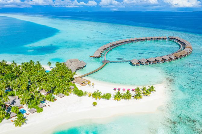 Freistehende Villen über der Lagune und via Holzsteg mit der Insel verbunden.