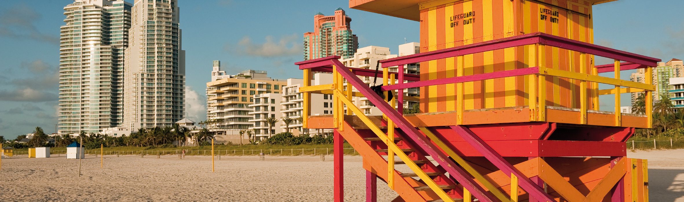 Eine angesagte und lebhafte Stadt, wo Trends gesetzt werden und sich Kulturen vereinen. Der feinsandige Strand und das tiefblaue Meer machen Miami auch zu einer beliebten Badeferiendestination und die unzähligen, pastellfarbenen Art Déco Gebäude verleihen dieser Stadt ein besonderes Flair.