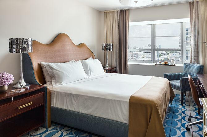Stilvolle Zimmer mit Dusche, WC, Föhn, Bademantel; Telefon, TV, Kaffee-/Teekocher, iPhone-Docking-Station, Safe, Klimaanlage und Sicht auf South Beach und Miami. Die Partial-Ocean-View-Zimmer verfügen über die gleiche Ausstattung, bieten jedoch seitliche Meersicht.