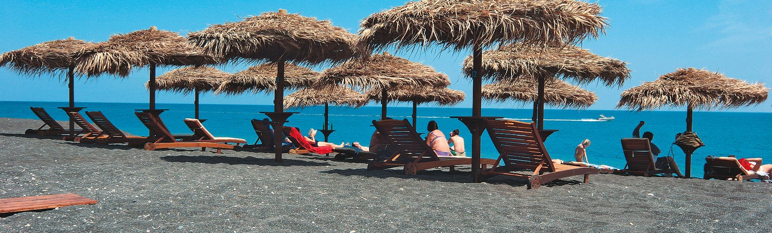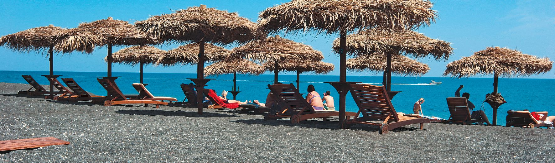 Das malerische kleine Dorf Monolithos liegt in der Nähe von Kamari im Osten von Santorini und verdankt seinen Namen einem 33 m hohen Fels, der ein Ableger des Inselberges Profitis Ilias (567 m) ist. Das Gestein ist hier nicht vulkanisch, sondern besteht aus Marmor und Phyllit. Auf dem Felsen befindet sich das kleine Kloster Agios Ioannis, wo jeweils am 24. Juli zu Ehren des Heiligen Johannes das Panigyri-Fest gefeiert wird. Das grösste Highlight des Ortes ist der herrliche Lavastrand mit seinem schwarzen Sand, an dem sich überall kleine Bimssteine finden lassen. Der Strand fällt flach ins kristallklare Wasser ab und ist somit für Familien mit Kindern bestens geeignet. Im Hintergrund spenden einige Bäume wohltuenden Schatten. Im Ort gibt es mehrere Kafenions und Tavernen mit einer typisch griechischen Atmosphäre und lokalen Spezialitäten.