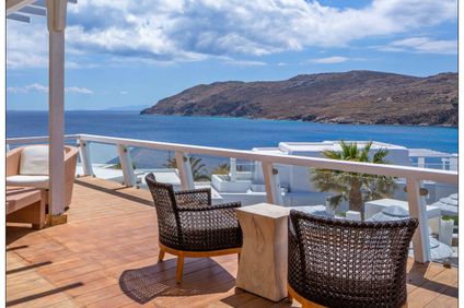 Leicht erhöht, nur ca. 40 m vom kleinen, ruhigen Loulos-Strand entfernt. Zum schönen, hellen Sandstrand von Kalo Livadi mit wenigen Restaurants gehen Sie ca. 300 m. Mykonos-Stadt mit seinen engen Gassen und den zahlreichen Boutiquen, Bars, Galerien und Restaurants liegt rund 12 km entfernt. Es bestehen regelmässige Linienbusverbindungen, eine Bushaltestelle befindet sich in ca. 100 m Entfernung. Bis zum Flughafen Mykonos sind es ca. 10 km und zum Hafen ca. 12 km.