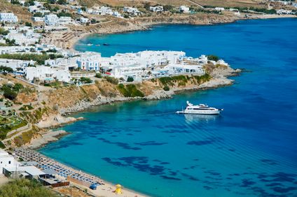 Das beliebte und gepflegte Erstklasshotel liegt wunderschön auf einem Felsvorsprung zwischen der Plati-Gialos- und der Psarou-Bucht mit herrlicher Aussicht auf das Meer.