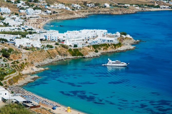 Etwa 50 m vom öffentlichen Sandstrand von Plati Gialos entfernt auf einem Felsvorsprung gelegen. Nur etwa 500 m bis zum westlich benachbarten Psarou-Strand. Mit Badebooten sind weitere herrliche Sandstrände wie Paradise, Superparadise, Agrari und Elia bequem erreichbar. Nach Mykonos-Stadt (ca. 4 km) gibt es regelmässige Busverbindungen, die Bushaltestelle liegt direkt beim Hotel. Einige Tavernen und Minimärkte befinden sich in Plati Gialos und am Psarou-Strand. Der Flughafen Mykonos ist rund 5 km entfernt.