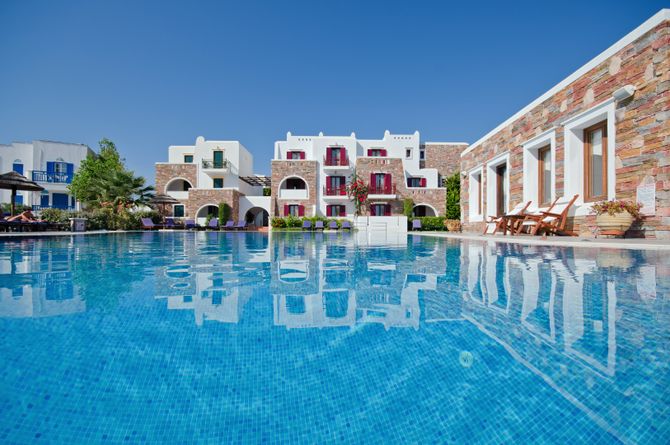 Die typische Architektur der Kykladen und die beste Lage am Strand von Agios Georgios versprechen Strandferien vom Feinsten – und das Versprechen wird gehalten.