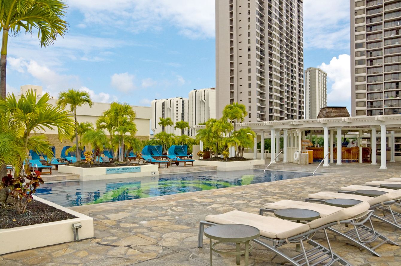 Modern, mit hawaiianischem Dekor, Bad, Dusche, WC, Föhn, TV, Telefon, Klimaanlage, Kaffeekocher, Mini-Kühlschrank, Balkon. Die City-View-Zimmer liegen in den unteren Etagen und bieten Sicht auf die umliegenden Gebäude. Die Deluxe-Mountain-View-Zimmer liegen in den oberen Etagen und haben Sicht auf die Berge. Die Deluxe-Ocean-View-Zimmer bieten Meersicht.