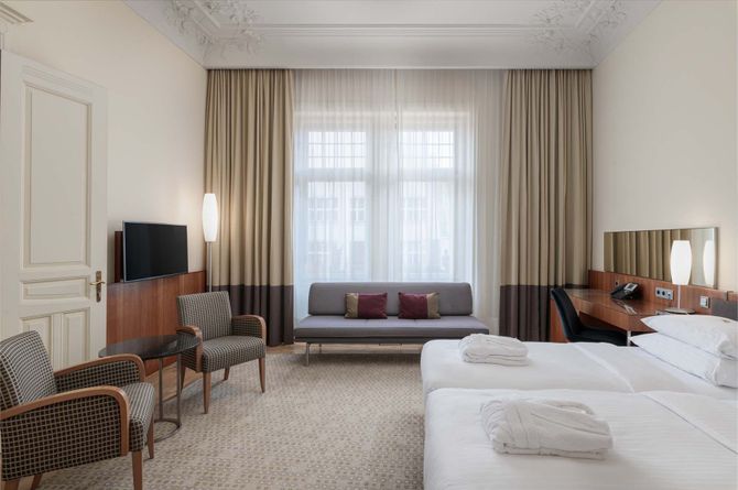 An äusserst zentraler Lage am Rande der bezaubernden Altstadt von Prag ist das Hotel umgeben von diversen Restaurants, Bars und Geschäften. Viele bekannte Sehenswürdigkeiten des Altstädter Rings wie beispielsweise das Rathaus mit der berühmten astronomischen Uhr oder die Teynkirche mit ihren 80 m hohen Türmen sind etwa 900 m entfernt. Bei einem Spaziergang durch die verwinkelten Gassen der pittoresken Altstadt entdecken Sie faszinierende Galerien, Museen und Boutiquen. Den Welnzelsplatz erreichen Sie nach rund 1,2 km. Bis zur Karlsbrücke, welche über die Moldau von der Altstadt zur attraktiven Kleinseite führt, ist es knapp 1,5 km. Die Prager Burg mit dem Veitsdom und herrlichem Panoramablick auf die Stadt ist ca. 3 km entfernt. Die nächste U-Bahnstation Namesti Republiky ist knapp 200 m, der Hauptbahnhof rund 1 km entfernt. Den Flughafen Prag erreichen Sie mit den öffentlichen Verkehrsmitteln in etwa 50 Minuten.