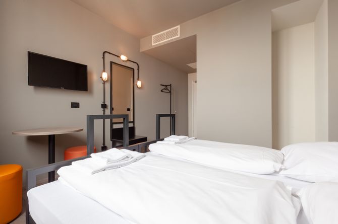 Das a&o Venedig Mestre 2 befindet sich mitten im Stadtteil Mestre, der auf dem Festland liegt. In der Umgebung finden Sie einige Restaurants, Bars und Einkaufsmöglichkeiten. Das historische Stadtzentrum liegt mitten in der Lagune von Venedig und ist über die Brücke Ponte della Libertà mit Mestre verbunden. Sie erreichen die Altstadt nach etwa 10 km. In den malerischen Gassen Venedigs erwarten Sie einige schöne und beeindruckende Gebäude wie die Scuola Grande di San Rocco und die berühmte Brücke Ponte di Rialto, die den Canal Grande überspannt. In einer Entfernung von rund 11 km liegt die Piazza San Marco mit dem prächtigen Markusdom, dem Dogenpalast und der Libreria Vecchia. Für Ihre Mobilität sorgen die knapp 200 m entfernte Bushaltestelle Rampa Cavalcavia Vempa und der Bahnhof Venezia Mestre in ca. 550 m.