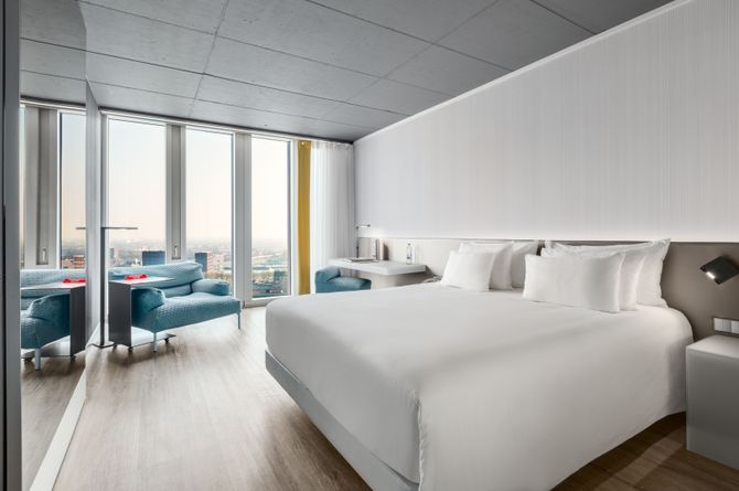 Modernes Viersternehotel im Wolkenkratzer «De Rotterdam» mit Top-Aussicht auf die Stadt und den Fluss Maas. Erkunden Sie Rotterdam, eines der kulturellen Zentren der Niederlande!