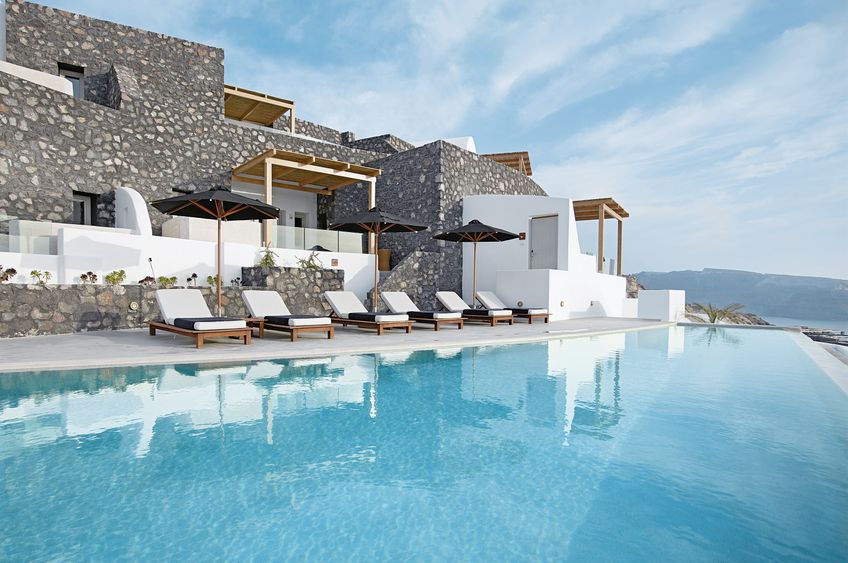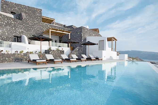 Das Santo Pure Oia Suites and Villas in ägäischer und kykladischer Architektur wird von viel Weiss, kombiniert mit Stein, dominiert. Die weiss getünchten, einstöckigen Gebäude verteilen sich in der ganzen Anlage und vermitteln so ein hohes Mass an Ruhe und Privatsphäre. Zur modernen Einrichtung gehört ein helles Empfangsgebäude mit Réception sowie WLAN (gratis). Vorzügliches A-la-carte-Restaurant mit lokaler, kreativer Küche und exzellentem Service, Poolbar mit Terrasse. Bibliothek. Parkplätze gratis (nach Verfügbarkeit). In der gepflegten Aussenanlage befinden sich 6 Süsswasserpools, davon 3 Infinity-Pools mit Sonnenterrassen. Die Nutzung von Liegestühlen, Sonnenschirmen und Badetüchern an den Pools ist gratis.