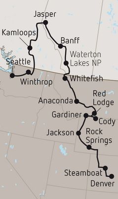 Die Reise beginnt in Seattle, führt durch die prachtvollen Cascade Mountains in die Rocky Mountains und zum Sonnenbaden ans Ufer des Lake Louise bei Banff. Von hier geht es zurück in die USA durch die gezackten Gipfel des Glacier-Nationalparks in die majestätische Schönheit des Yellowstone-Parks. Die Fahrt endet via Rocky-Mountain-Nationalpark in Denver.