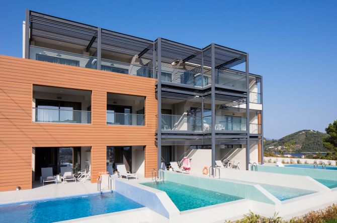 Die Architektur im minimalistischen Design vereint die Elemente Erde und Wasser und schafft so eine natürliche, stilvolle Atmosphäre. Moderner, einladender Empfangsbereich mit Réception und WLAN (gratis). Snackbar mit Terrasse. Parkplatz gratis. Wunderschöner Aussenbereich mit Pool und Sonnenterrasse mit traumhaftem Blick auf Skiathos. Die Nutzung von Liegestühlen und Sonnenschirmen am Pool ist gratis.