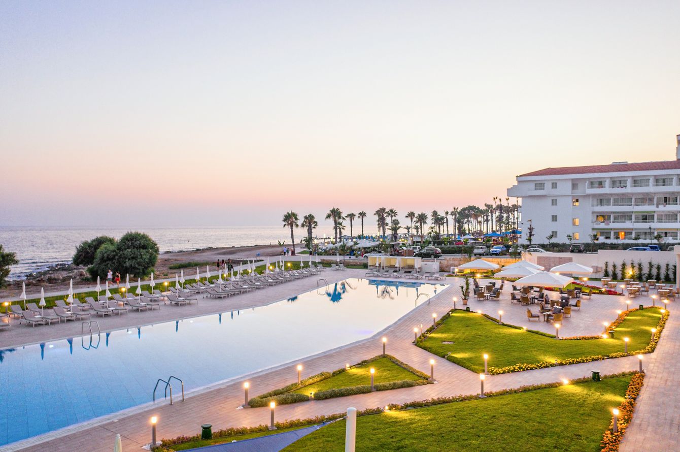 Nur durch eine kleine Strandpromenade vom Strandabschnitt getrennt. Weitere Strände befinden sich in der Nähe. Geschichtsliebende besuchen nach ungefähr 3 km die archäologischen Stätte von Nea Paphos mit verschiedenen historischen Sehenswürdigkeiten. Die Stadt Paphos mit diversen Einkaufsmöglichkeiten, Restaurants und Bars befindet sich knapp 6 km vom Hotel entfernt. Eine Bushaltestelle erreichen Sie nach etwa 400 m. Die Distanz zum Flughafen Paphos beträgt ca. 10 km und bis zum Flughafen Larnaka ca. 135 km.