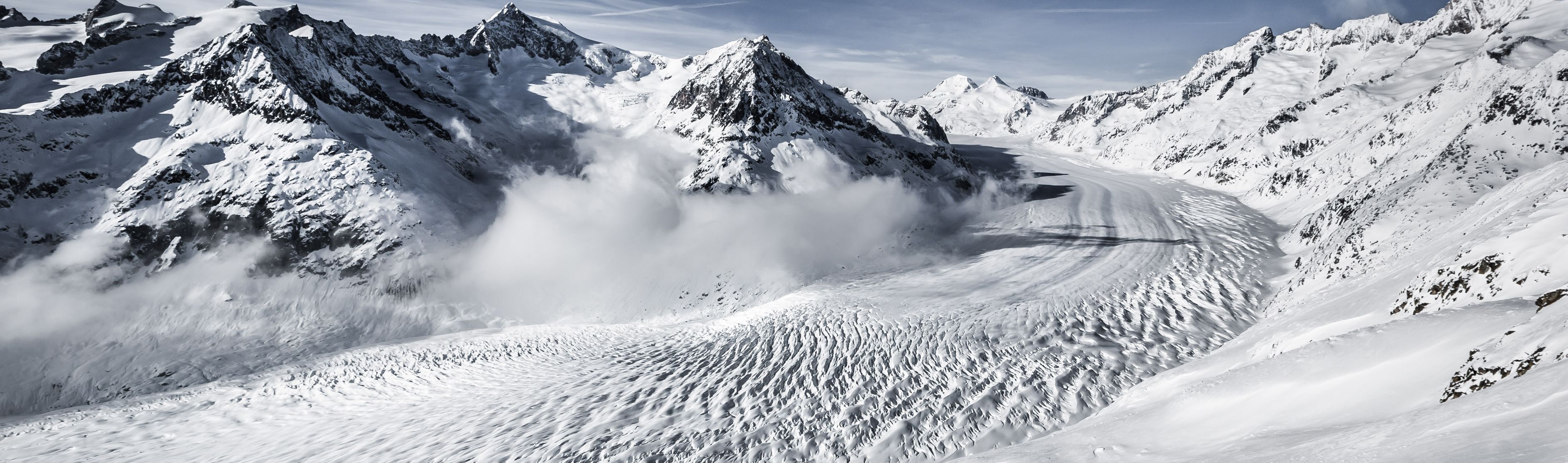 Le grand glacier d'Aletsch, avec ses 20 km de long, est le plus grand des Alpes et, en tant que paysage d'une beauté unique et d'une diversité exceptionnelle, il fait partie depuis 2001 du patrimoine mondial de l'UNESCO Alpes suisses Jungfrau-Aletsch. Couvrant une superficie d’environ 79 km2, ce géant glaciaire pèse 10 milliards de tonnes.