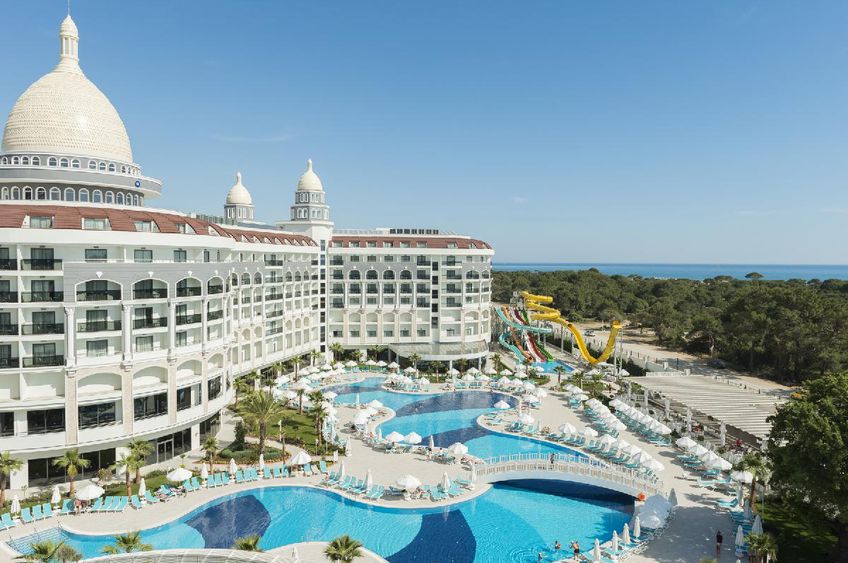 Avec ses tours et ses coupoles blanches, l’architecture de l’hôtel évoque un palais moderne et féerique. Hall de réception, Internet sans fil gratuit. Restaurant-buffet principal proposant des spécialités internationales, 2 restaurants à la carte servant des plats italiens et turcs, 6 bars, snack-bar et café. Amphithéâtre. Parc agrémenté de 2 piscines (dont une avec 6 toboggans), terrasse et bar attenant, bar de plage. Chaises longues et parasols gratuits à la piscine et la plage. Draps de bain contre dépôt.
