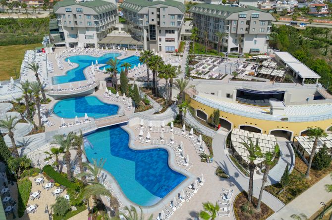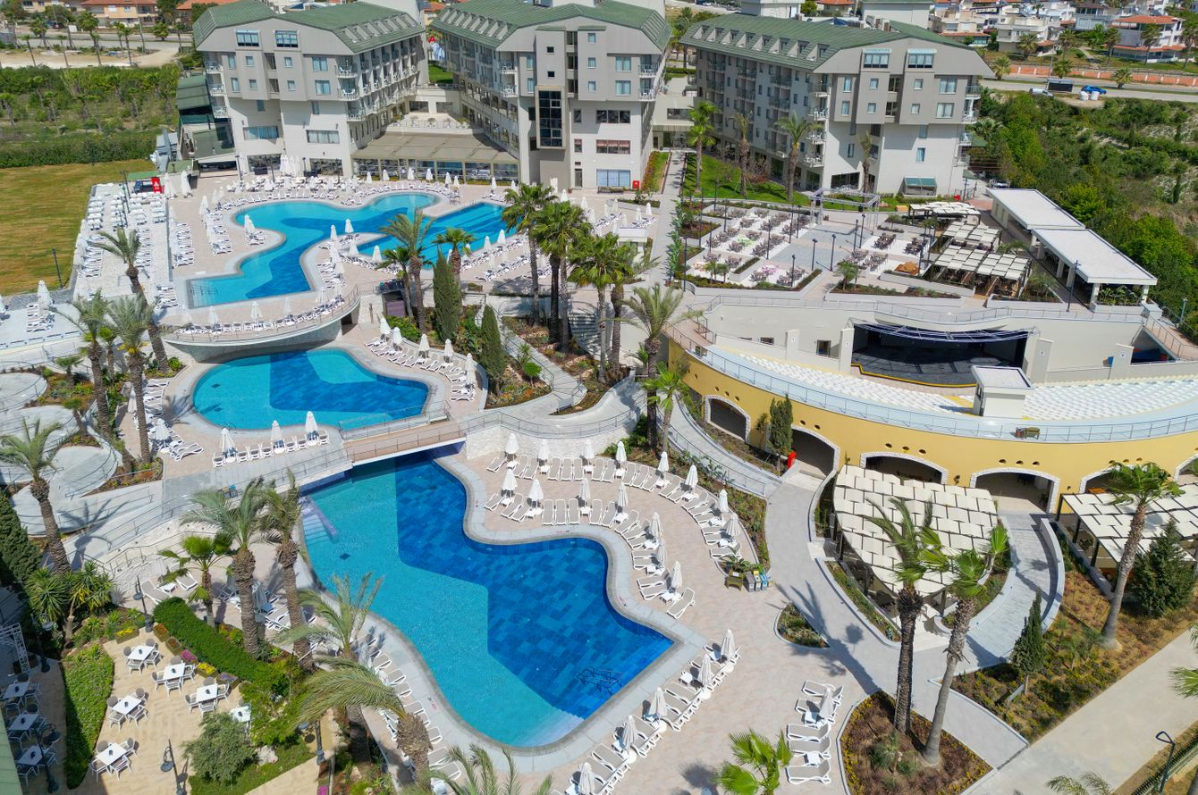 Hall de réception, wifi gratuit dans les espaces communs. Restaurant-buffet international, restaurant à la carte méditerranéen, bar de piscine, bar de plage, bars. Amphithéâtre, boutique, boutique de souvenirs, salle de jeux, salon de coiffure. Vaste espace piscine avec 4 piscines (dont 1 chauffée selon saison), parc aquatique (séparé de l'hôtel par une rue) et terrasse. Chaises longues, parasols et draps de bain gratuits à la piscine et à la plage. Change de draps de bain payant. Parking gratuit (selon disponibilité).