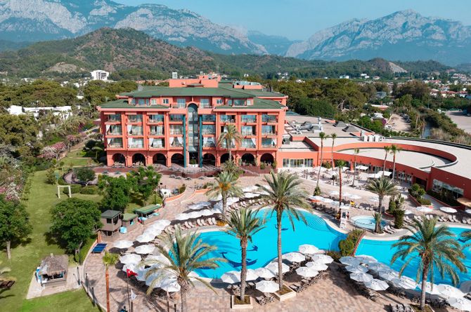Grand hall de réception, wifi gratuit. Restaurant-buffet principal international, 4 restaurants à la carte (turc, italien, asiatique, poisson), pâtisserie, café, bars et bar à la plage. Amphithéâtre, commerces et salon de coiffure. Espace extérieur avec piscine et terrasse, snack-bar et parc aquatique avec 7 toboggans. Chaises longues, parasols et draps de bain gratuits à la piscine et à la plage. Pavillons de plage payants. Parking gratuit selon disponibilité.