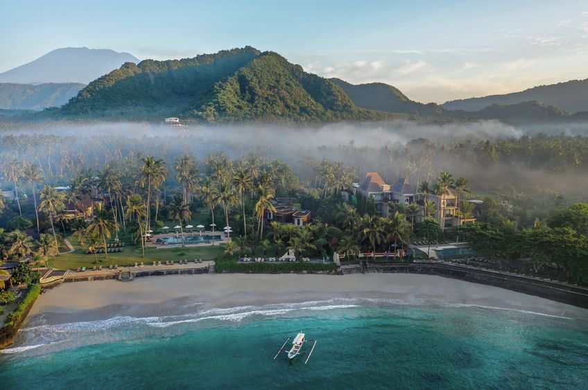 Blotti dans une baie pittoresque de la côte est, directement sur une plage de sable. À 5 minutes de route de la localité côtière de Candidasa. À 90 minutes du sud de Bali.