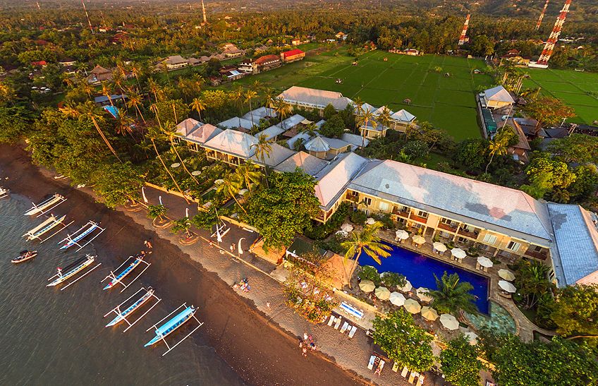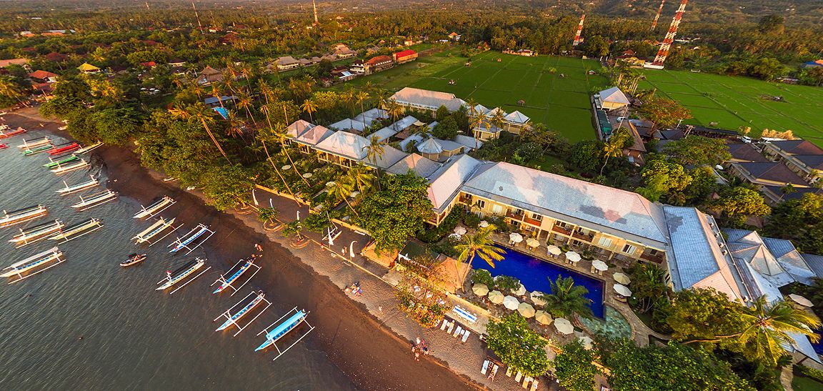 Au nord de Bali, au bord de la plage de sable de 200 m de long. À 10 km de Singaraja, l’ancienne capitale de Bali. À 105 km de l’aéroport de Denpasar.