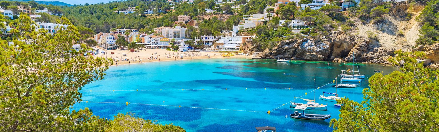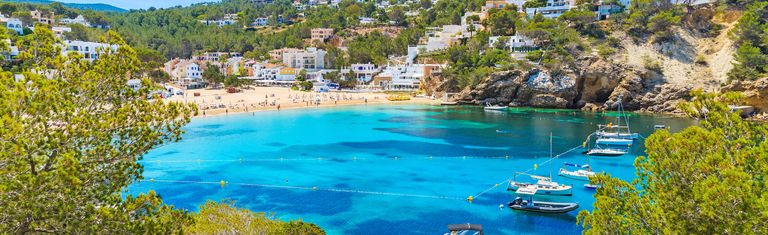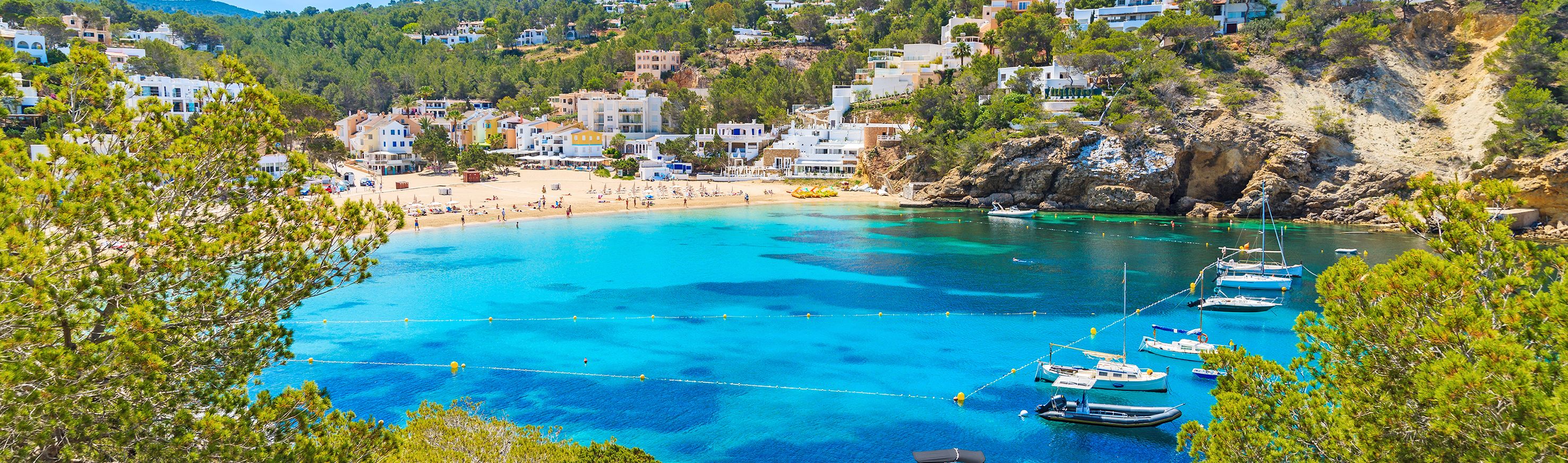 Petit centre de villégiature, Cala Vadella s'ouvre sur un vaste domaine de villas avant de se terminer par un lacis de ruelles étroites épousant les coteaux ombragés par des pinèdes et formant un accès à la baie, dont la paisible plage offre des aménagements de grande qualité. De cette calanque est né un petit village de pêcheur du nom de Cala Vadella, composé en majorité d'immeubles résidentiels et de villas épousant harmonieusement la baie et ses environs. Un hameau adjacent à la partie nord de la baie présente un décor nostalgique constitué d'anciennes cabanes de pêcheurs fidèlement restaurées pour certaines et encore utilisées de nos jours. Cala Vadella est encerclée au nord et au sud par des falaises escarpées, protections efficaces contre les forts courants marins, transformant ainsi la baie en un bassin naturel propice à la baignade. La plage de sable clair et fin est baignée par une eau cristalline et calme, convenant parfaitement à la natation ou à la plongée. Les enfants peuvent aussi y barboter sans risques. Selon les marées, il est possible de parcourir 50 mètres vers le large tout en ayant pied. Longue de 200 mètres et large de 75 mètres, la plage est suffisamment spacieuse pour absorber le flot de visiteurs, même en période estivale. Restaurants, bars, boutiques et supermarchés se trouvent à un jet de pierre. La vie nocturne de Cala Vadella est plutôt discrète; d'ailleurs, les légendaires fiestas sur la plage ont lieu à un autre endroit. Néanmoins, les spectacles en soirées demeurent uniques: les couchers de soleil distillent une atmosphère extraordinaire mâtinée de romantisme. La baie protégée dispose d'un port apprécié qui accueille des yachts à voile et à moteur dont le balaie confère en soirée une allure de petit spectacle. Pour apprécier la côte passant par Cala Vadella, rien de mieux qu'un tour à bord d'un chalutier ancien. Grotte des pirates, îlot Isla Conillera, île magique protégée d'Es Vedra au large de Cala d'Hort et ses formations rocheuses insolites, chèvres sauvages, tour des pirates, plongée libre dans l'eau bleu turquoise au large des côtes: ce tour en bateau vous garantit une expérience unique voire inoubliable lorsque les rayons du soleil couchant viennent caresser le pont du bateau au retour de votre excursion. Les promenades et les randonnées dans la nature de l'arrière-pays de Cala Vadella vous promettent des moments riches en émotions. Les marcheurs plus chevronnés peuvent facilement se rendre aux baies de Cala Carbo, Cala d'Hort ou Cala Moli.