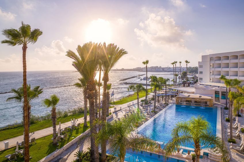 Sur une colline de pins, directement en face d’une plage de sable et de gravier dotée du pavillon bleu et accessible par un escalier. À côté d’un monument à la gloire d’Alexandre le Grand. À proximité immédiate de plusieurs restaurants et cafés. À 700 m des bars et clubs. À 1,5 km du port de Paphos, que l’on rejoint par la promenade qui sépare l’hôtel de la plage. En face d’un arrêt de bus. À 15 km de l’aéroport de Paphos et à 135 km de l’aéroport de Larnaca.