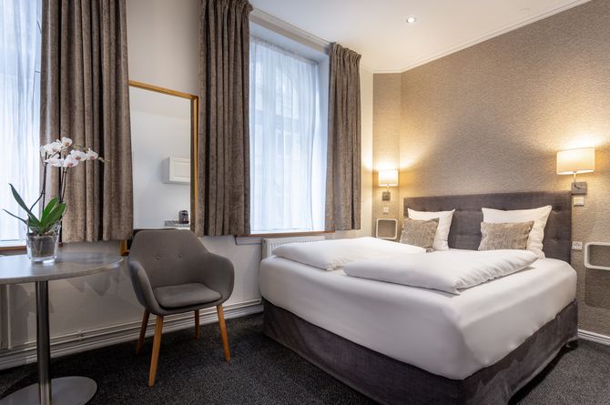 Modernes, les chambres (18–25 m2) ont douche, WC, sèche-cheveux, téléphone, TV, Internet sans fil gratuit, coffre-fort payant, bouilloire, machine Nespresso, cuisinette avec minifrigo, four à micro-ondes et grille-pain. Certaines chambres (35 m2) ont lits simples supplémentaires. Max. 4 adultes. Au même aménagement de base que les chambres, les suites Junior (30 m2) ont en sus espace chambre-salon séparé, bain à remous et climatisation.