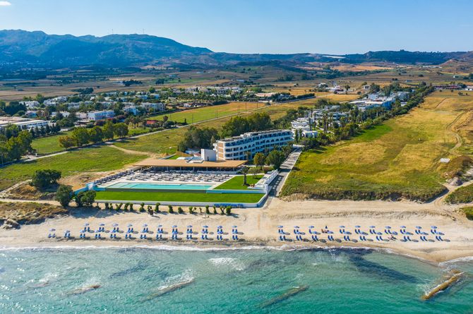 Privilégiée, au nord de l’île de Cos, près de la localité de Mastichari. Séparé de la plage de sable en pente douce par une petite promenade. À 4 km des restaurants, bars et commerces du centre de Mastichari. À 20 km de Cos. À 10 km de l'aéroport de Cos.