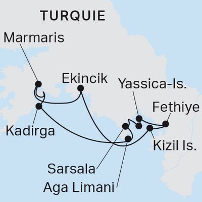 7: Aga Limani-baie de Kadirga-Paradise Island-Marmaris Cap sur la baie de Kadirga avec temps libre pour se baigner. Continuation vers Paradise Island (également appelée Cennet Adasi). Arrivée à Marmaris en fin d’après-midi. Temps pour visiter Marmaris. Nuit dans le port de Marmaris.