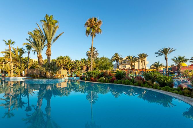 Cet établissement construit dans le style local typique a hall de réception, salon, bar dans le hall et wifi gratuit. Restaurant-buffet principal méditerranéen avec terrasse, restaurant à la carte international, 5 restaurants thématiques servant des spécialités marocaines, tunisiennes, internationales, libanaises et fruits de mer, restaurant de plage avec spécialités de grillades (de julliet à août) et 2 cafés mauresques. Bar de plage et cocktail-bar. Boutiques. Palmeraie soignée avec 2 piscines, l’une dotée de toboggans, terrasse et bar. Chaises longues, parasols et draps de bain gratuits à la piscine et à la plage.