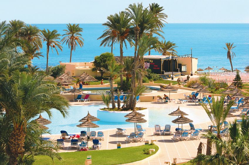 Au bord de la plage de sable fin en pente douce, à 60 mn de l'aéroport de Djerba et 2 km du centre de Zarzis. Desserte régulière par bus; commerces à proximité.